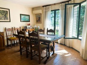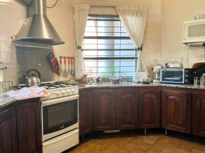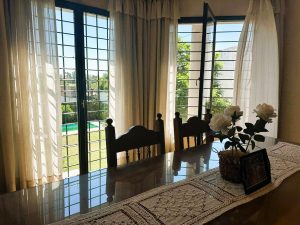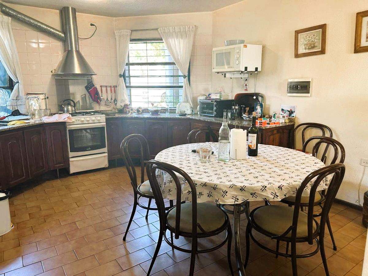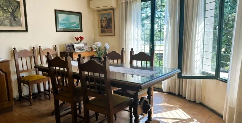 - Áreas Sociales: Una amplia cocina integrada con comedor diario y estar conforman el corazón de la casa, ideal para la vida en familia. Las imágenes del comedor muestran un espacio generoso con un gran ventanal que da al jardín, amueblado con una mesa y sillas de madera, y con aire acondicionado, lo que sugiere un ambiente confortable. En el comedor se aprecia un gran aparador de madera con objetos decorativos y cuadros en las paredes, contribuyendo a un ambiente acogedor. La cocina, de estilo tradicional, cuenta con muebles de madera oscura, encimeras de granito. En total, la casa cuenta con 11 ambientes, incluyendo todas las áreas sociales y privadas.