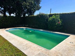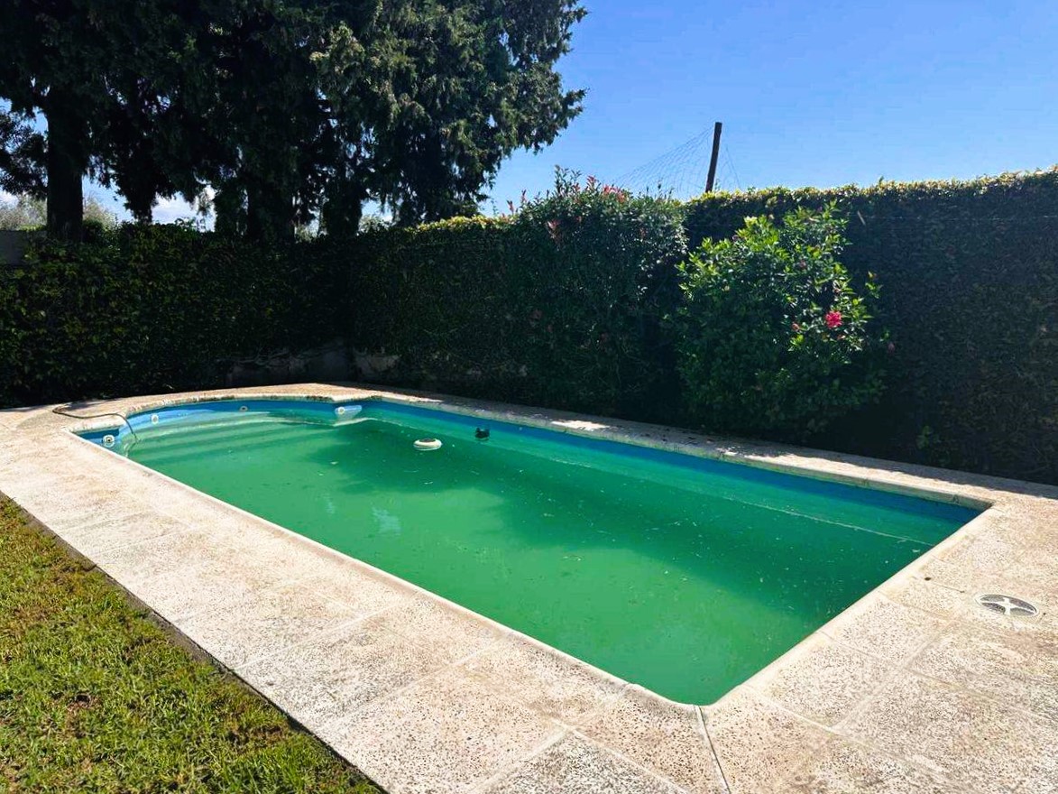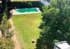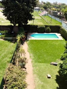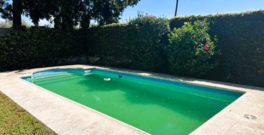 - Amplio Jardín y Exteriores: La propiedad cuenta con un gran patio con césped, perfecto para actividades al aire libre y reuniones familiares. Se incluyen imágenes que muestran un jardín bien cuidado con una piscina (en varias fotos se aprecia el agua de la piscina un poco turbia y con un pato inflable, lo que indica necesidad de mantenimiento, pero su estructura y tamaño son excelentes), y un área de asador, creando un espacio ideal para el esparcimiento. La fachada de la casa desde el patio presenta un estilo tradicional con una pared cubierta de enredaderas y un árbol maduro que proporciona sombra, añadiendo un toque pintoresco y natural. Una vista elevada del patio resalta su amplitud y la privacidad que brindan los setos.