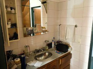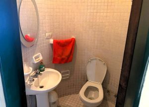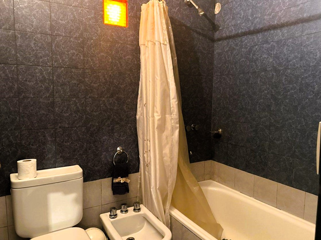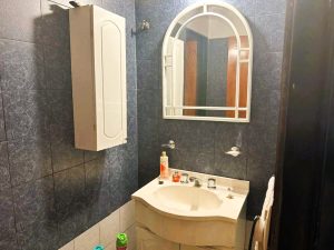 - Baños: Cuenta con un baño principal zonificado, práctico para el uso familiar, y un toilette de recepción para visitas, sumando un total de 4 baños. El toilette se muestra con azulejos pequeños, inodoro y lavamanos con espejo ovalado. Se observan dos baños adicionales: uno con mesada de mármol, bacha de acero, espejo grande y muebles de madera, y otro con azulejos grises, bañera, bidet, inodoro y un botiquín blanco colgado. Además, incluye una habitación de servicio con baño completo.