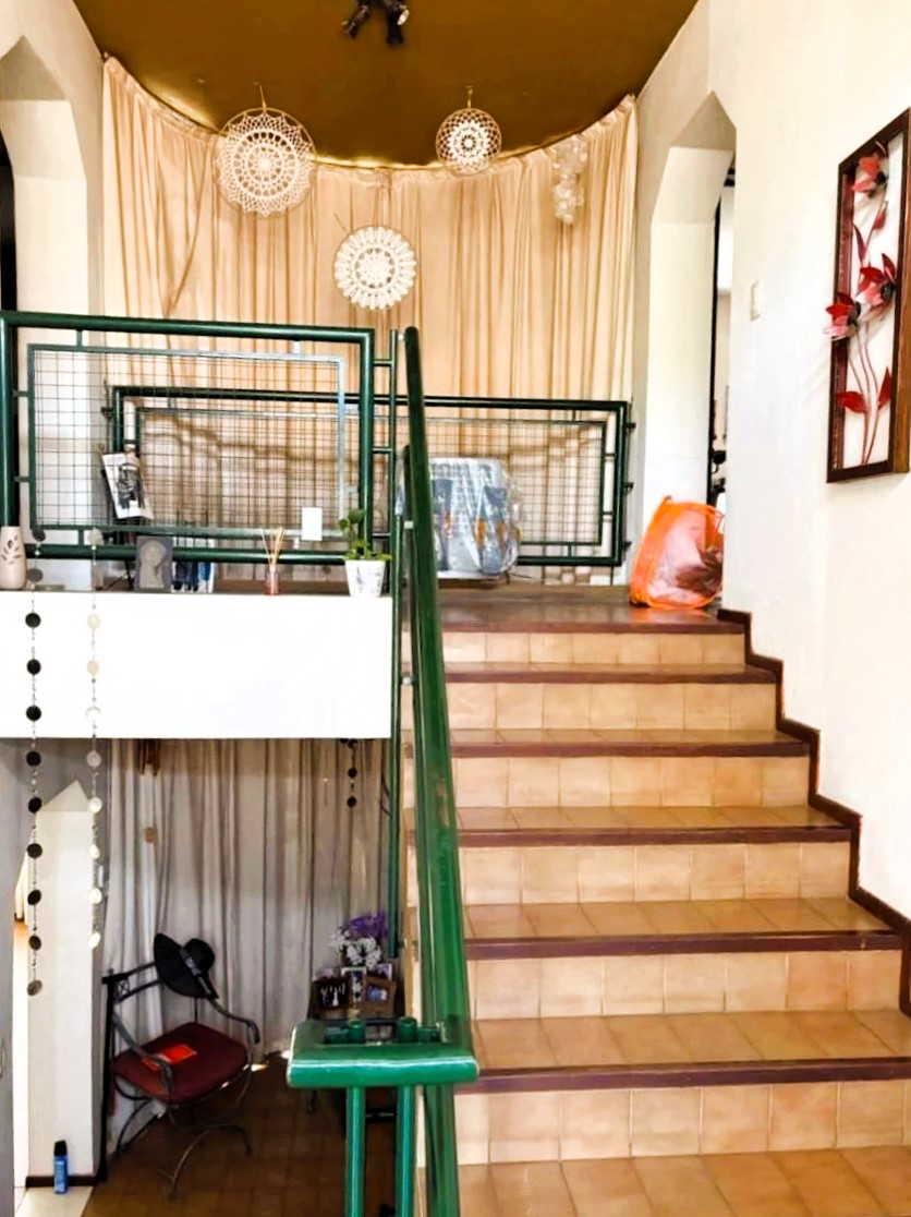 - Conexiones internas: Las escaleras interiores, con peldaños de baldosas y barandales verdes, conectan los diferentes niveles de la casa, añadiendo un toque de diseño funcional.