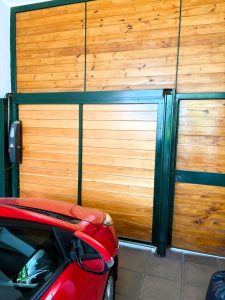 - Cochera: La cochera doble, tanto cubierta como descubierta, se integra armoniosamente con el diseño y proporciona espacio suficiente para varios vehículos. Una imagen del interior de la cochera muestra un portón de madera y un auto rojo estacionado, confirmando la funcionalidad del espacio.