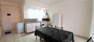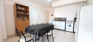 La cocina integrada cuenta con muebles bajo mesada, mesada de granito, cocina a gas y espacio para heladera y lavarropas.